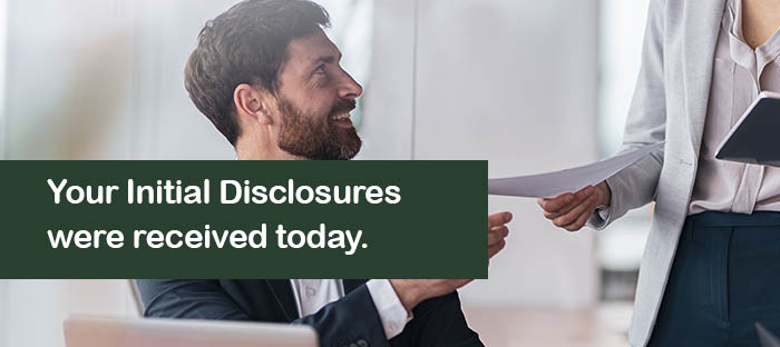 Your Initial Disclosures have been received for your property located at 18727 La Guardia St. After they have been reviewed, we will let you know if anything else is needed to submit your file to Processing.